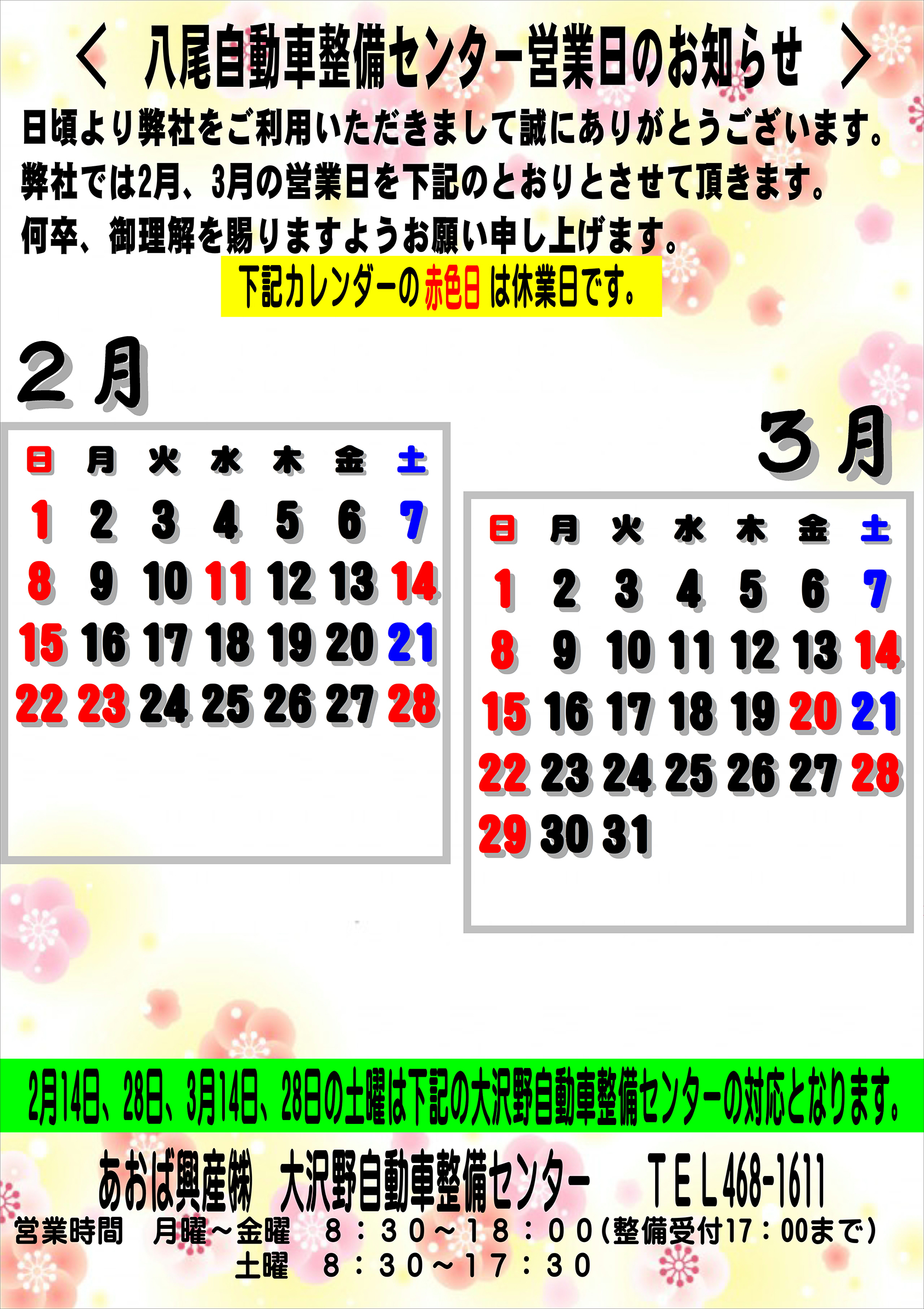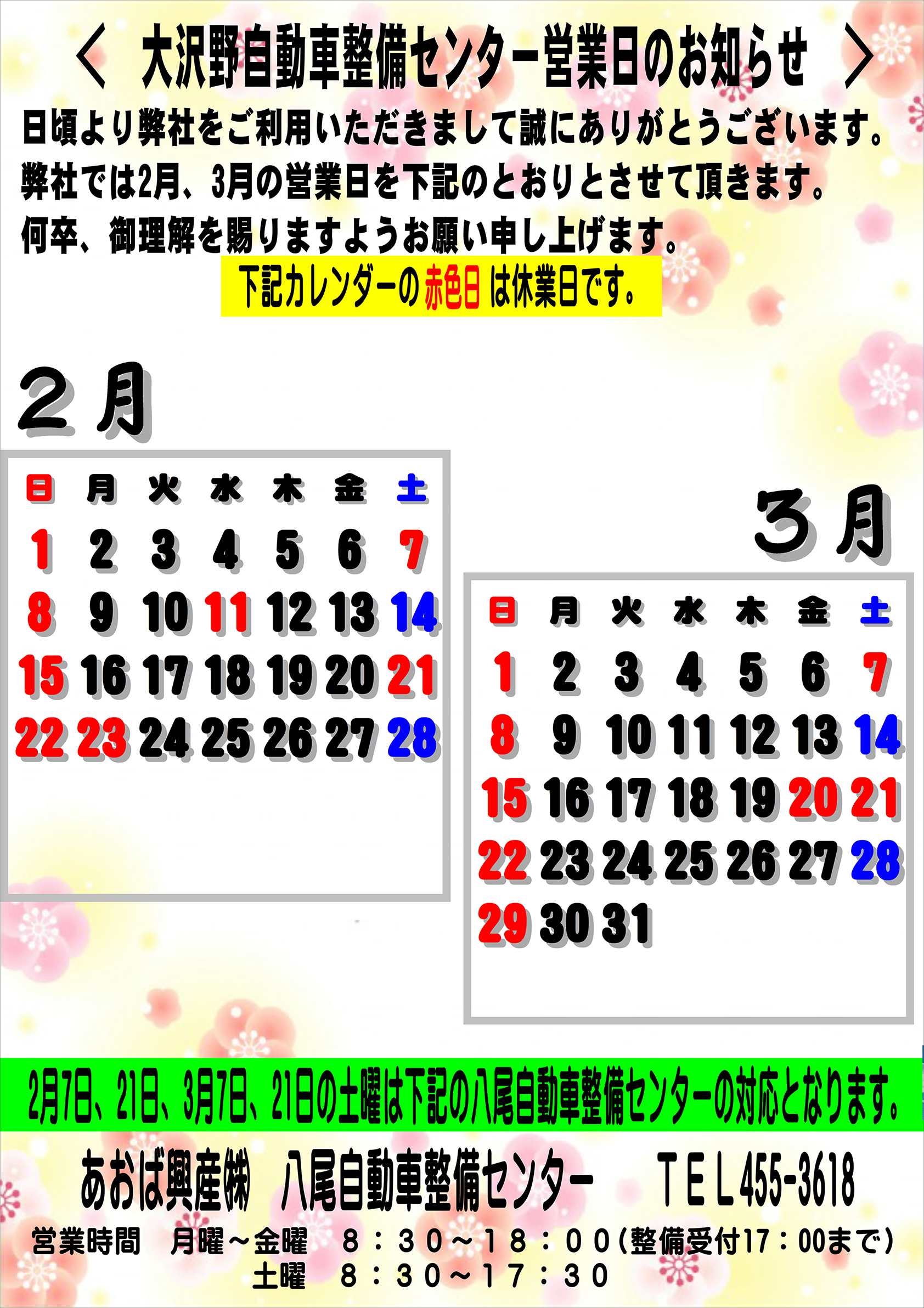 休 日 日曜・祝祭日 隔週土曜日 詳しくは下記カレンダーをご覧下さい。