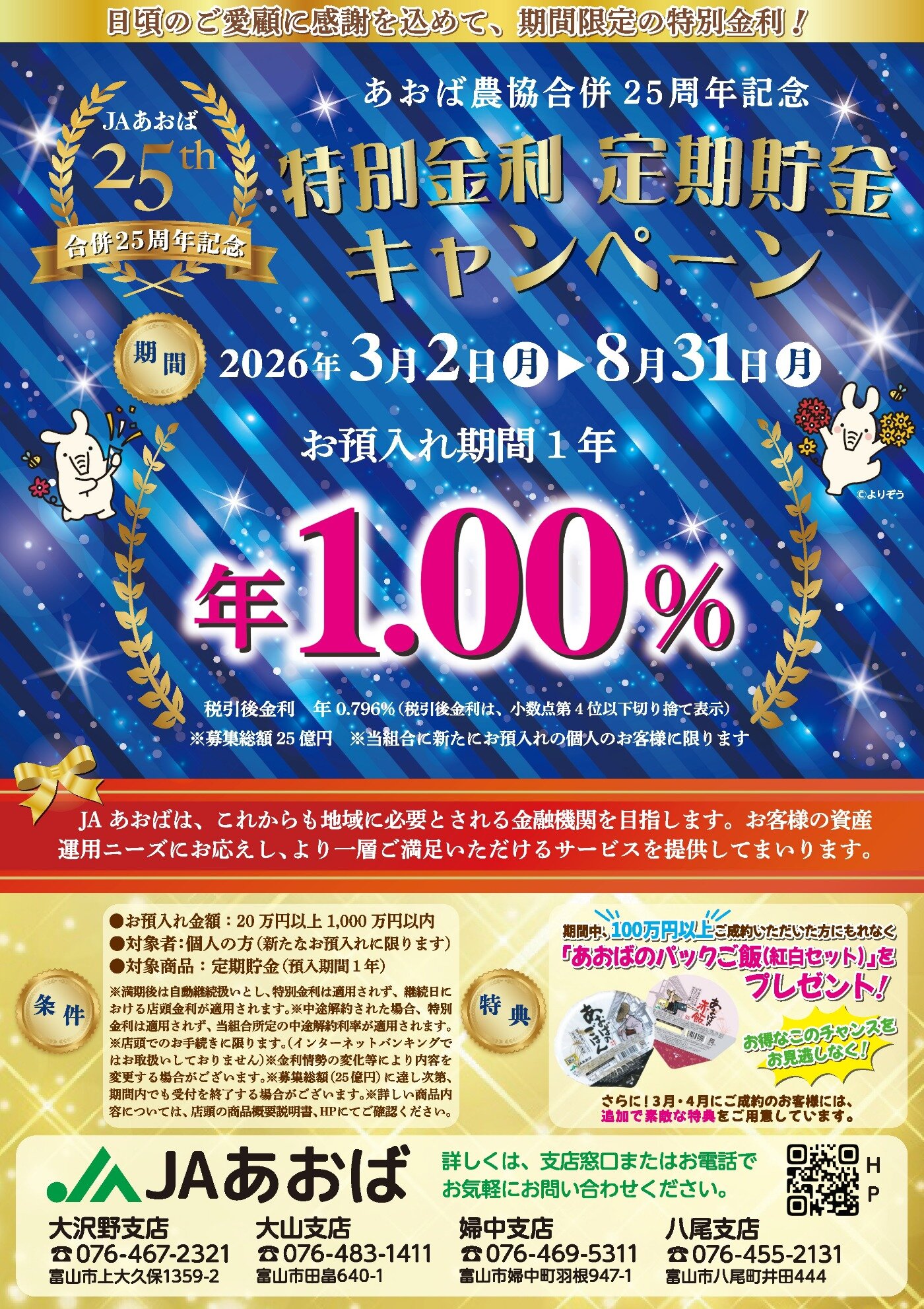 地域の皆様へ JAあおばでは、合併25周年を記念して、特別金利定期貯金キャンペーンを開催いたします!! 日頃のご愛顧に感謝を込めて、期間限定の特別金利になります。 募集総額(25億円)に達し次第、期間内でも受付を終了する場合がございますので、ご了承ください。