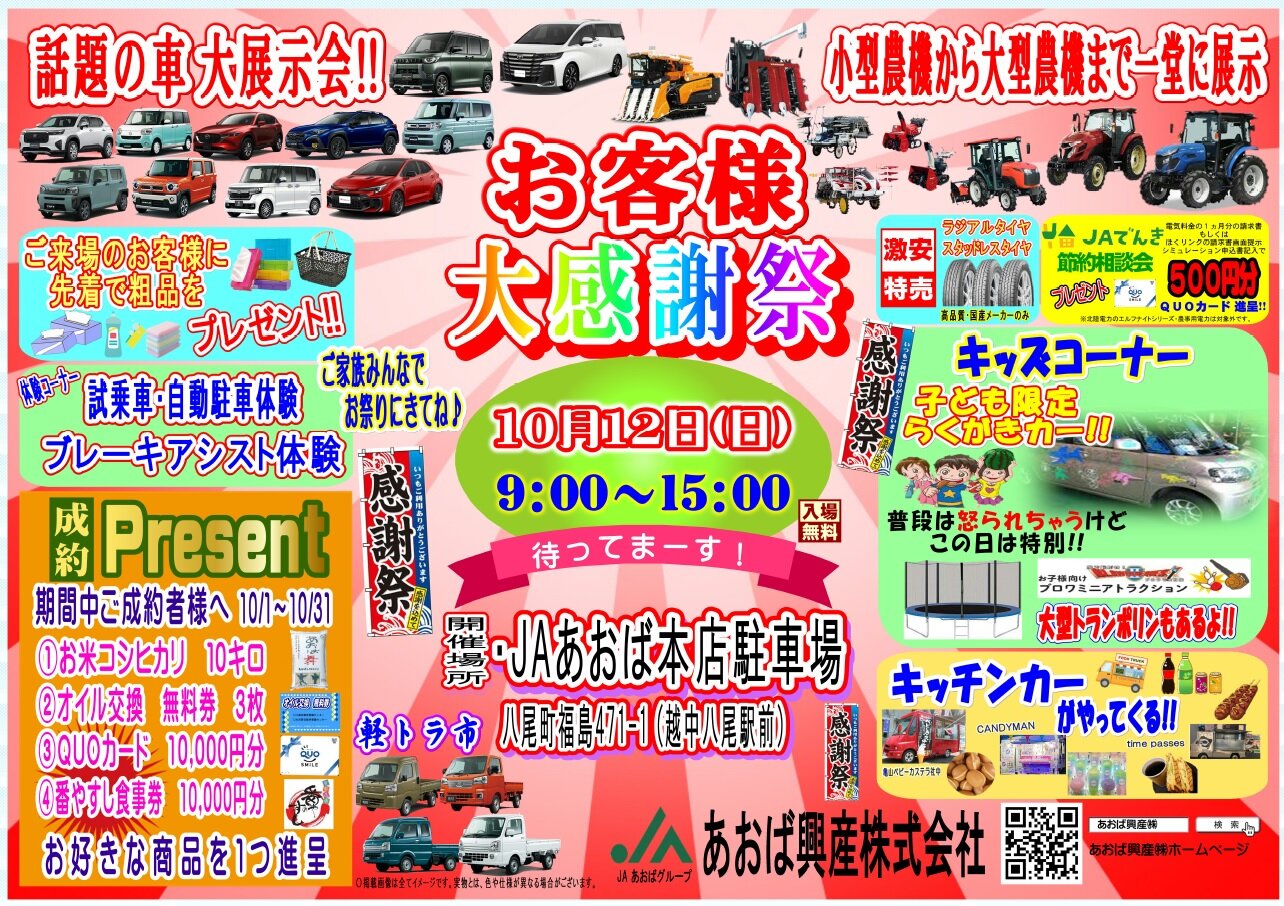 あおば興産(株)は、日頃のご愛顧いただいている組合員、地域の皆様に感謝の気持ちを込めて「お客様大感謝祭2025」開催いたします!! 色々な催し物をご用意しスタッフ一同、心よりお待ちしております。