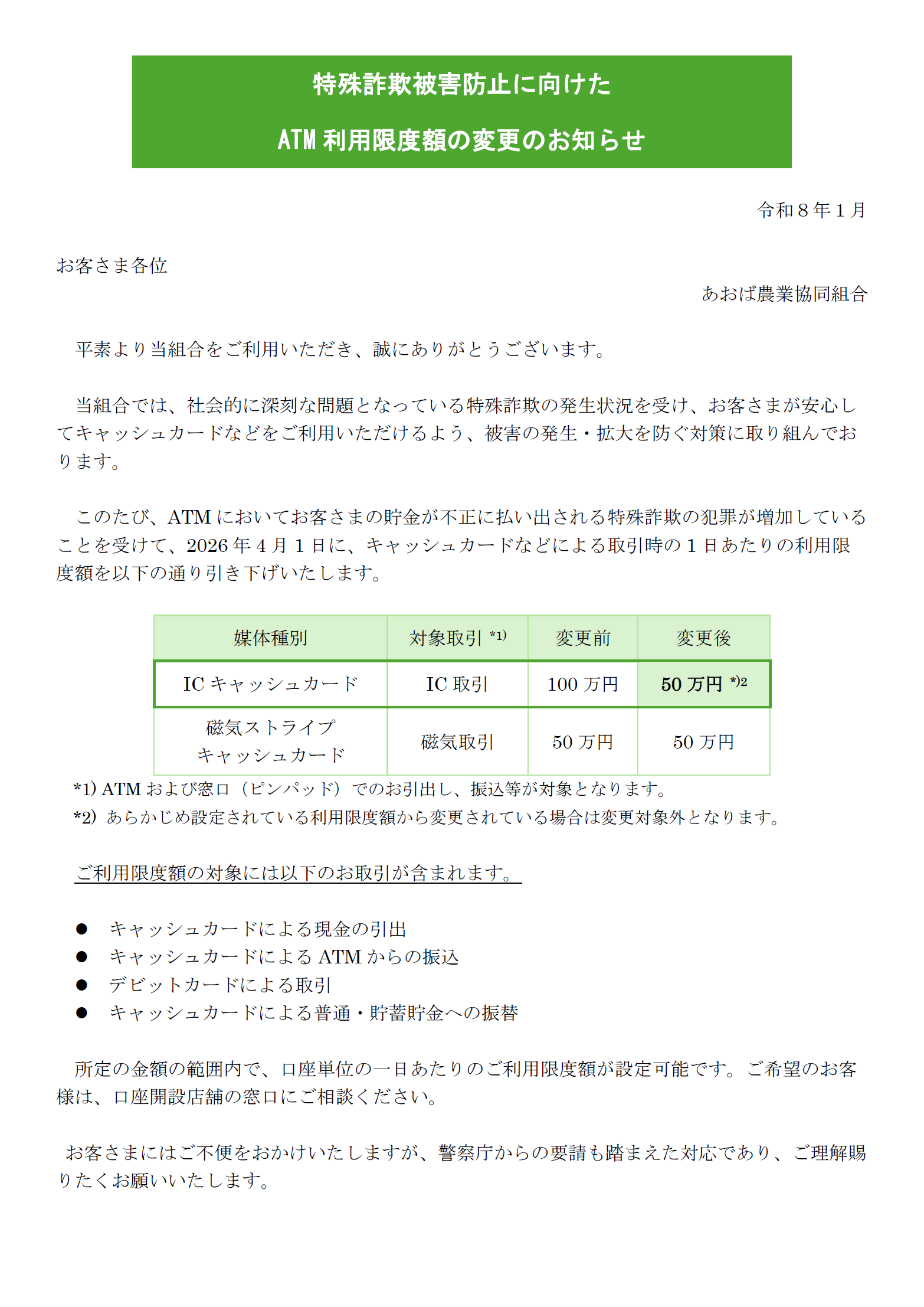 【重要】特殊詐欺被害防止に向けたATM利用限度額の変更のお知らせ
